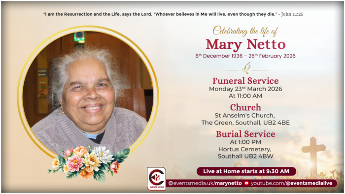 https://youtu.be/Psqu2gwAEAg On Monday 23rd March 2026Home Service starts at 9:30 AMFuneral Service is at 11:00 AM, at St Anselm’s Church, Southall, UB2 4BEBurial Service is a 1:00 PM, at Hortus Cemetery, Southall, UB2 4BE Total Views: 14 ,